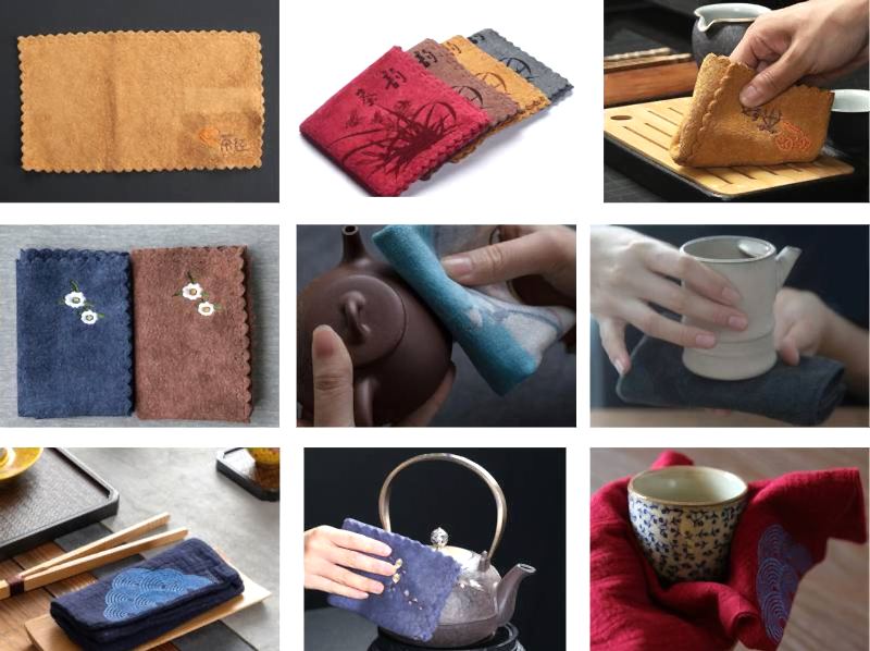 Чайное полотенцечацзинь茶巾 - обязательный аксессуар мастера чайной церемонии. Основная функция полотенца - поддерживать идеальную чистоту, впитывая потеки на чашках и чайниках, случайные капли воды на поверхности чайного столика и т.д. Когда церемония окончена, чайную утварь необходимо вымыть и тщательно высушить, протереть во избежание разводов. Поэтому очень важно, чтобы материал, из которого сшито полотенце, был максимально гигроскопичен. Для этой цели лучше всего подходит натуральный хлопок, лен, конопля. В последние годы все чаще в ход идет и качественная микрофибра. Помимо поддержания чистоты, чайное полотенце служит для защиты пальцев чайного мастера от ожогов, когда он придерживает горячую крышку или чайник, особенно это актуально во время церемонии с большим количеством участников.