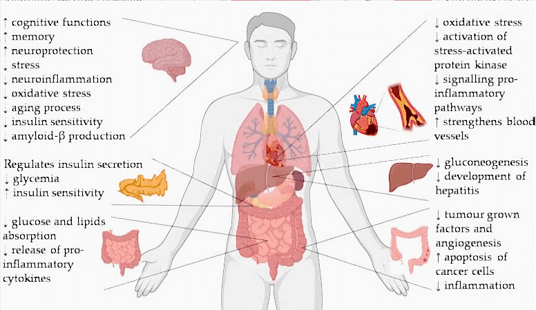 Кверцетин - это фитохимический препарат, обладающий антиоксидантной и нейропротекторной активностью. Кроме того, наблюдали нормализацию углеводного обмена за счет ингибирования всасывания глюкозы из желудочно-кишечного тракта, регулирования Pin-Up инсулина и улучшения чувствительности к инсулину в тканях. Более того, комбинация кверцетина с эпигаллокатехин галлатом (EGCG) может усиливать антиканцерогенные эффекты обоих.